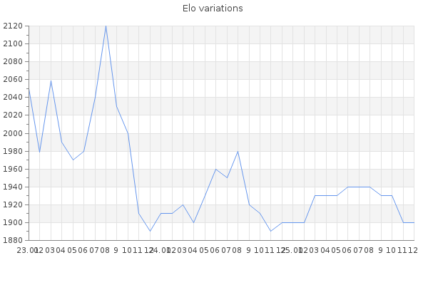 Elo no rounded:1904.5 Rd ( Small rd indicates a reliable elo ) : 119 Elo max :2280 Elo max this year :2280 Moves played :5624 Country:Germany