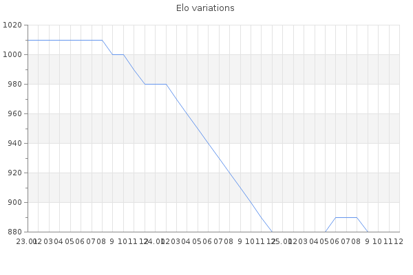 Elo no rounded:883.9 Rd ( Small rd indicates a reliable elo ) : 83 Elo max :1550 Elo max this year :1550 Moves played :4564 Country:France
