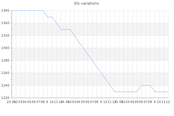 Elo no rounded:1232.4 Rd ( Small rd indicates a reliable elo ) : 80 Fast Elo :1379 Fast Rd : 194 Elo max :1920 Elo max this year :1920 Moves played :51001 Country:Australia
