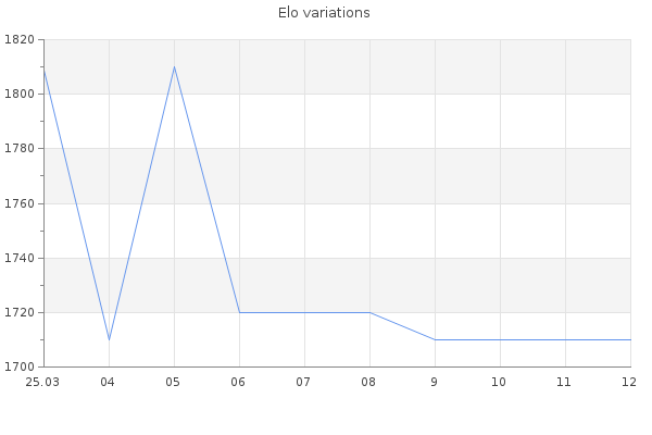 Elo no rounded:1710.9 Rd ( Small rd indicates a reliable elo ) : 115 Elo max :1810 Elo max this year :1810 Moves played :428 Country:Belgium