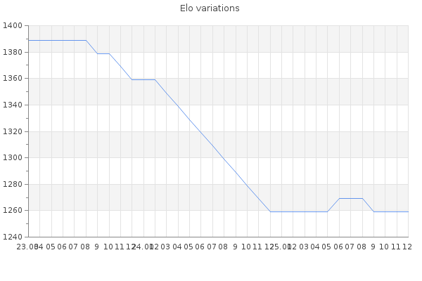 Elo no rounded:1255 Rd ( Small rd indicates a reliable elo ) : 268 Elo max :0 Elo max this year :0 Moves played :4 Country:United States of America