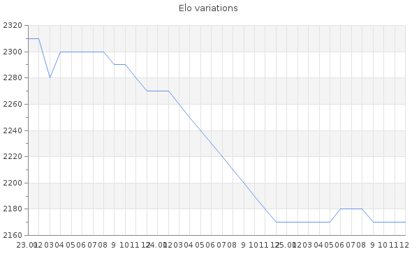 Elo no rounded:2174.1 Rd ( Small rd indicates a reliable elo ) : 101 Fast Elo :2039 Fast Rd : 160 Elo max :2490 Elo max this year :2490 Moves played :1965 Country:Portugal