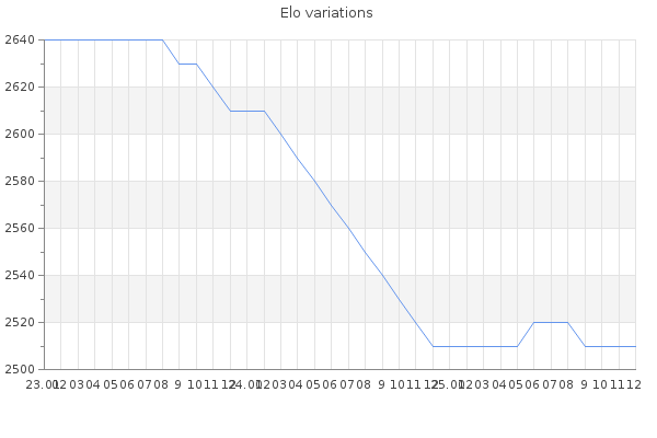 Elo no rounded:2512.7 Rd ( Small rd indicates a reliable elo ) : 89 Fast Elo :2069 Fast Rd : 221 Elo max :2750 Elo max this year :2750 Moves played :39264 Country:Poland