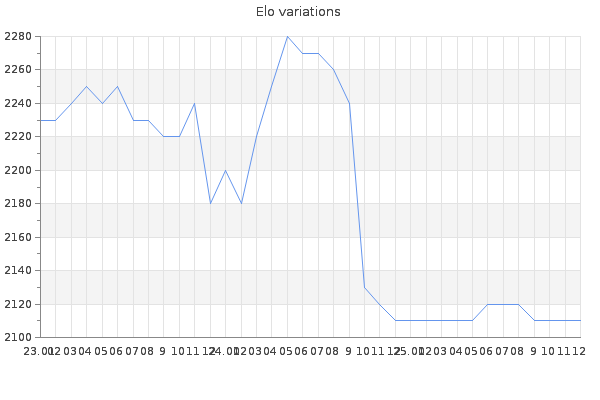 Elo no rounded:2105.8 Rd ( Small rd indicates a reliable elo ) : 91 Elo max :2310 Elo max this year :2310 Moves played :1714 Country:other Country
