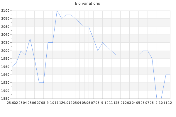 Elo no rounded:1935.2 Rd ( Small rd indicates a reliable elo ) : 84 Fast Elo :1810 Fast Rd : 106 Elo max :2390 Elo max this year :2390 Moves played :83018 Country:Italy