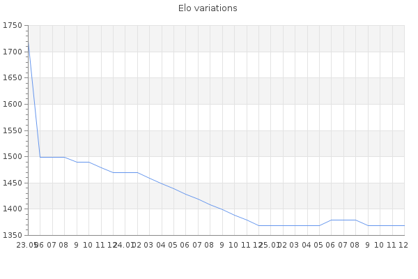 Elo no rounded:1365.2 Rd ( Small rd indicates a reliable elo ) : 167 Elo max :0 Elo max this year :0 Moves played :64 Country:Ukraine