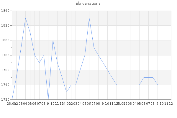 Elo no rounded:1744.5 Rd ( Small rd indicates a reliable elo ) : 84 Elo max :2020 Elo max this year :2020 Moves played :25686 Country:United States of America