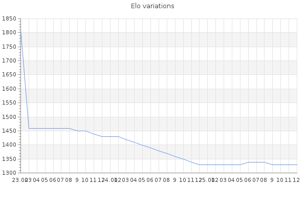 Elo no rounded:1327.1 Rd ( Small rd indicates a reliable elo ) : 167 Elo max :0 Elo max this year :0 Moves played :31 Country:Kazakhstan