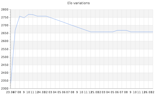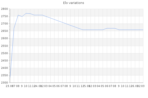 Elo no rounded:2657.7 Rd ( Small rd indicates a reliable elo ) : 152 Elo max :2770 Elo max this year :2770 Moves played :155 Country:Poland