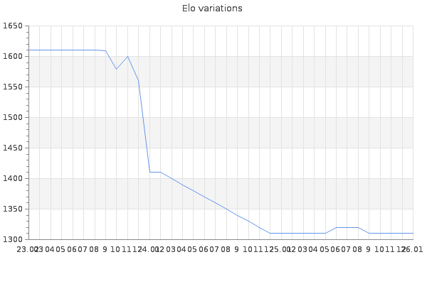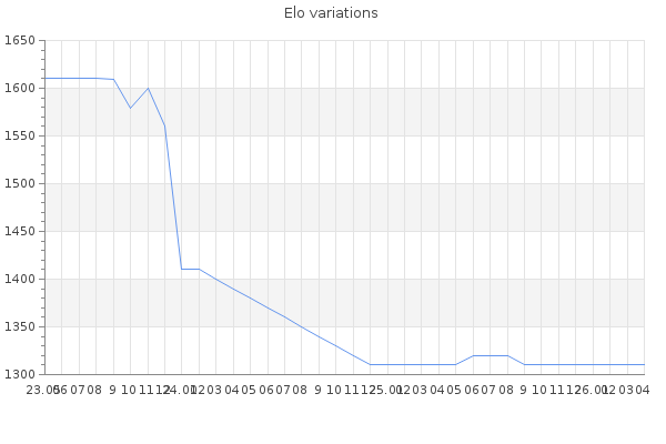 Elo no rounded:1313.3 Rd ( Small rd indicates a reliable elo ) : 111 Elo max :1890 Elo max this year :1890 Moves played :4190 Country:Poland