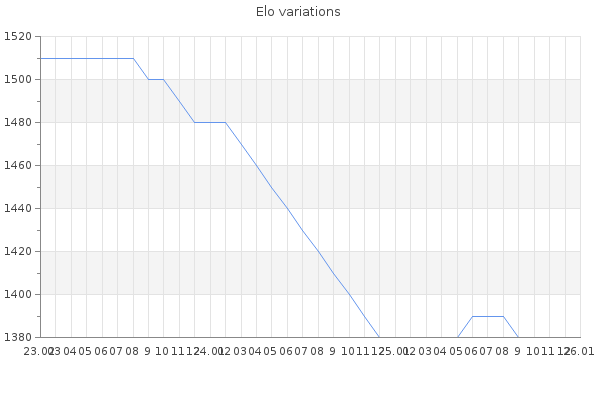 Elo no rounded:1383.1 Rd ( Small rd indicates a reliable elo ) : 120 Elo max :1790 Elo max this year :1790 Moves played :234 Country:Germany