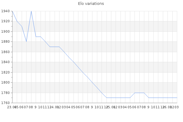 Elo no rounded:1768.3 Rd ( Small rd indicates a reliable elo ) : 90 Fast Elo :1669 Fast Rd : 177 Elo max :2170 Elo max this year :2170 Moves played :48010 Country:United States of America