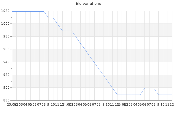 Elo no rounded:885.1 Rd ( Small rd indicates a reliable elo ) : 290 Elo max :0 Elo max this year :0 Moves played :4 Country:Spain