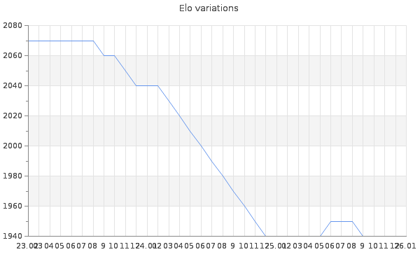Elo no rounded:1942.1 Rd ( Small rd indicates a reliable elo ) : 138 Elo max :2250 Elo max this year :2250 Moves played :368 Country:Russia