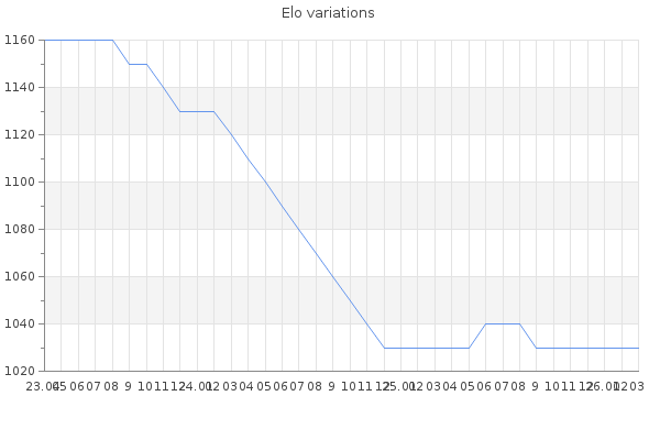 Elo no rounded:1033 Rd ( Small rd indicates a reliable elo ) : 121 Fast Elo :1439 Fast Rd : 290 Elo max :1410 Elo max this year :1410 Moves played :333 Country:Italy