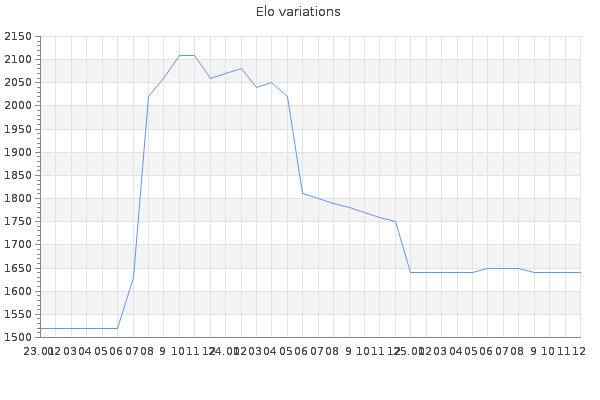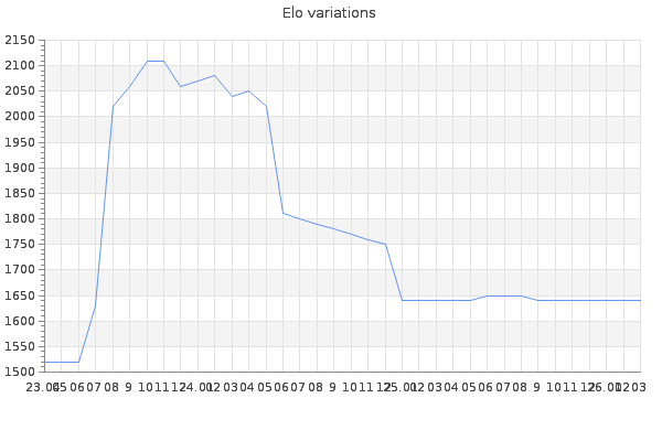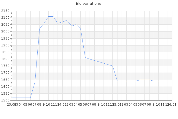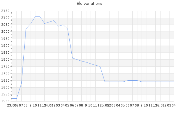 Elo no rounded:1644.3 Rd ( Small rd indicates a reliable elo ) : 97 Fast Elo :1980 Fast Rd : 96 Elo max :2360 Elo max this year :2360 Moves played :77394 Country:India