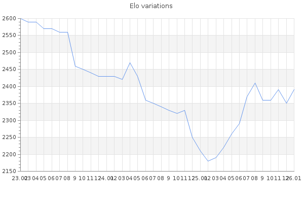 Elo no rounded:2388.9 Rd ( Small rd indicates a reliable elo ) : 80 Elo max :2790 Elo max this year :2790 Moves played :14341 Country:Spain