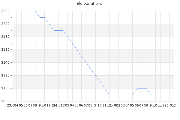 Elo no rounded:2094.9 Rd ( Small rd indicates a reliable elo ) : 80 Fast Elo :2009 Fast Rd : 151 Elo max :2730 Elo max this year :2730 Moves played :3674 Country:Italy