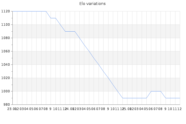 Elo no rounded:994.5 Rd ( Small rd indicates a reliable elo ) : 84 Elo max :1670 Elo max this year :1670 Moves played :362 Country:Romania
