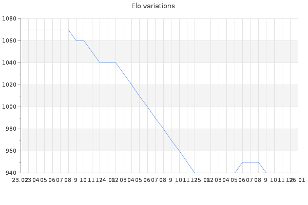 Elo no rounded:937.2 Rd ( Small rd indicates a reliable elo ) : 146 Elo max :1250 Elo max this year :1250 Moves played :49 Country:Poland
