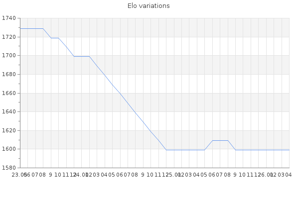 Elo no rounded:1602.1 Rd ( Small rd indicates a reliable elo ) : 158 Fast Elo :1679 Fast Rd : 244 Elo max :1920 Elo max this year :1920 Moves played :282 Country:Italy