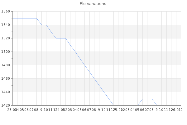 Elo no rounded:1422.6 Rd ( Small rd indicates a reliable elo ) : 148 Fast Elo :1339 Fast Rd : 213 Elo max :1810 Elo max this year :1810 Moves played :48326 Country:United Kingdom