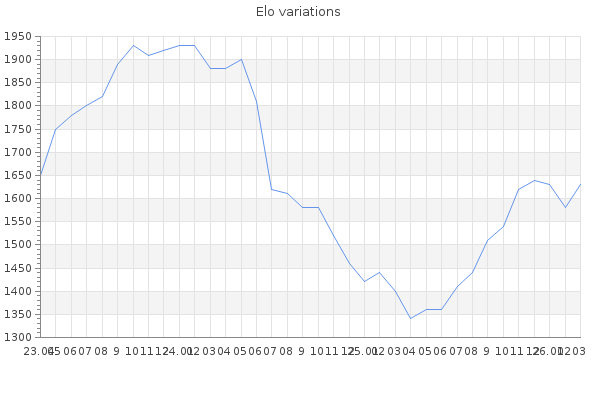 Elo no rounded:1627.9 Rd ( Small rd indicates a reliable elo ) : 80 Elo max :1980 Elo max this year :1980 Moves played :5781 Country:Brunei