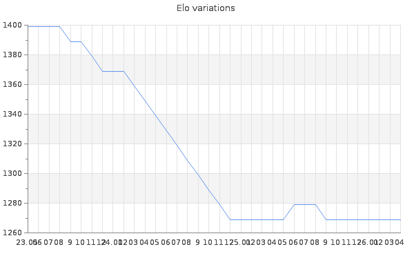 Elo no rounded:1270.6 Rd ( Small rd indicates a reliable elo ) : 196 Fast Elo :1459 Fast Rd : 275 Elo max :0 Elo max this year :0 Moves played :71 Country:United States of America