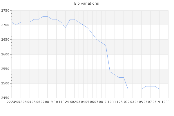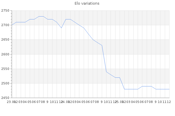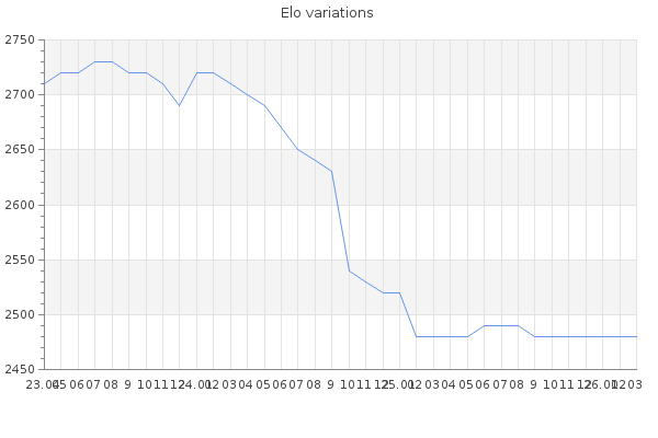 Elo no rounded:2482.7 Rd ( Small rd indicates a reliable elo ) : 122 Elo max :2740 Elo max this year :2740 Moves played :3296 Country:Cuba