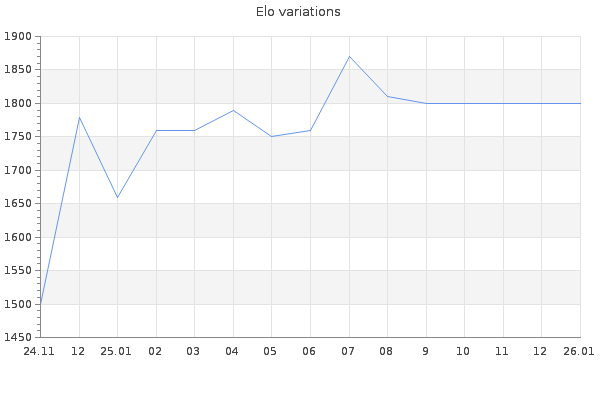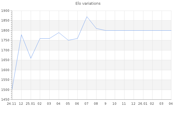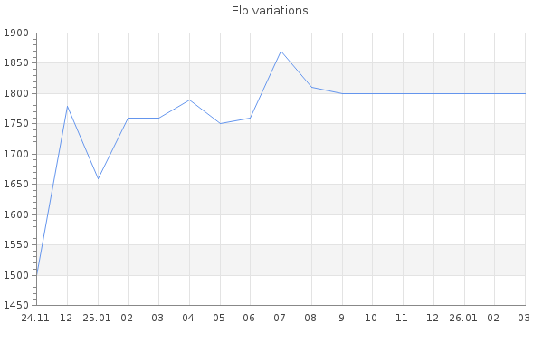 Elo no rounded:1802.4 Rd ( Small rd indicates a reliable elo ) : 119 Elo max :1870 Elo max this year :1870 Moves played :307 Country:Bulgaria