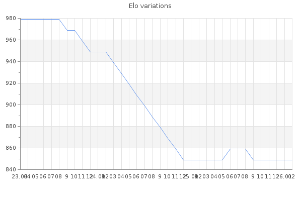 Elo no rounded:846.6 Rd ( Small rd indicates a reliable elo ) : 171 Fast Elo :1799 Fast Rd : 251 Elo max :0 Elo max this year :0 Moves played :105 Country:United States of America