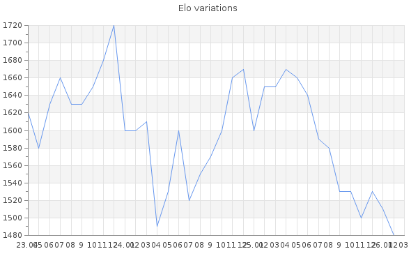 Elo no rounded:1477.5 Rd ( Small rd indicates a reliable elo ) : 86 Elo max :1750 Elo max this year :1750 Moves played :6912 Country:United States of America