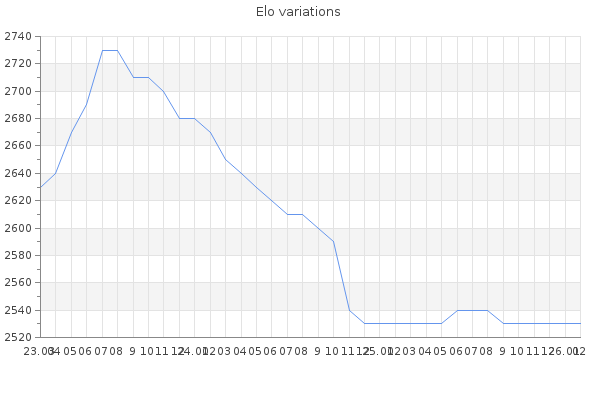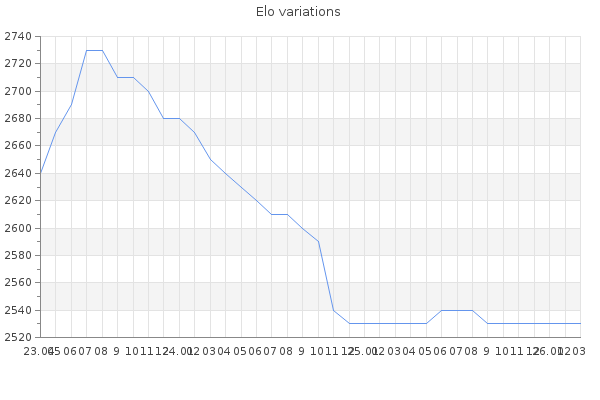 Elo no rounded:2525 Rd ( Small rd indicates a reliable elo ) : 121 Elo max :2860 Elo max this year :2860 Moves played :4479 Country:Azerbaijan
