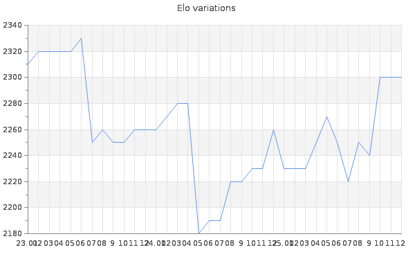 Elo no rounded:2296.9 Rd ( Small rd indicates a reliable elo ) : 99 Elo max :2340 Elo max this year :2340 Moves played :4410 Country:United States of America