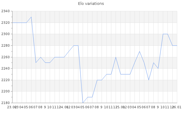 Elo no rounded:2279.8 Rd ( Small rd indicates a reliable elo ) : 97 Elo max :2340 Elo max this year :2340 Moves played :4582 Country:United States of America
