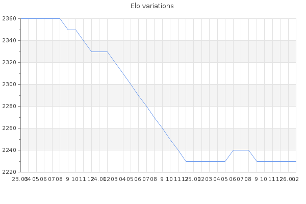 Elo no rounded:2233.6 Rd ( Small rd indicates a reliable elo ) : 80 Fast Elo :1809 Fast Rd : 226 Elo max :2740 Elo max this year :2740 Moves played :6242 Country:Spain