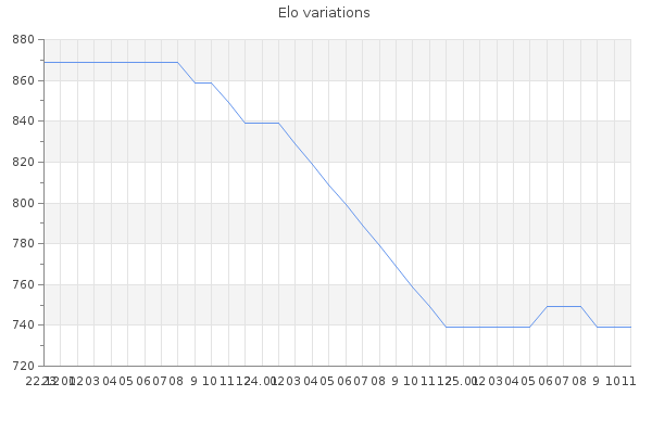 Elo no rounded:741.8 Rd ( Small rd indicates a reliable elo ) : 222 Fast Elo :1309 Fast Rd : 246 Elo max :1780 Elo max this year :1780 Moves played :219 Country:Romania