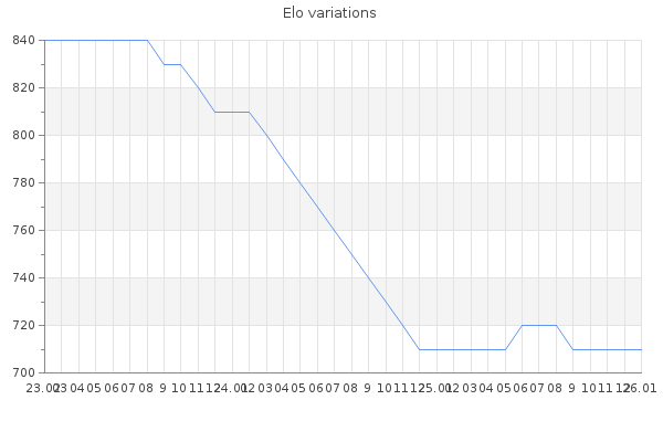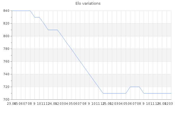Elo no rounded:705.4 Rd ( Small rd indicates a reliable elo ) : 130 Elo max :1070 Elo max this year :1070 Moves played :170 Country:United States of America