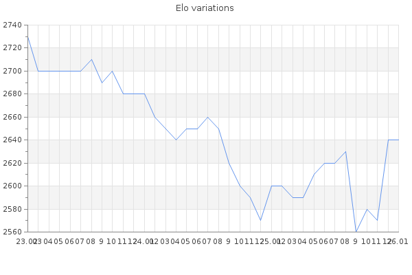 Elo no rounded:2643 Rd ( Small rd indicates a reliable elo ) : 80 Elo max :2930 Elo max this year :2930 Moves played :16227 Country:Germany