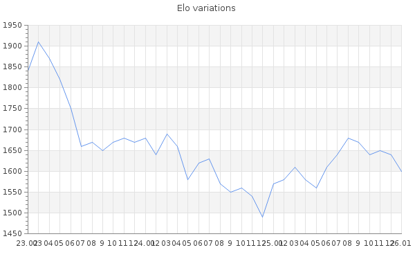 Elo no rounded:1598.7 Rd ( Small rd indicates a reliable elo ) : 81 Elo max :2010 Elo max this year :2010 Moves played :8220 Country:Australia