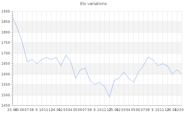 Elo no rounded:1596.6 Rd ( Small rd indicates a reliable elo ) : 86 Elo max :2010 Elo max this year :2010 Moves played :8365 Country:Australia