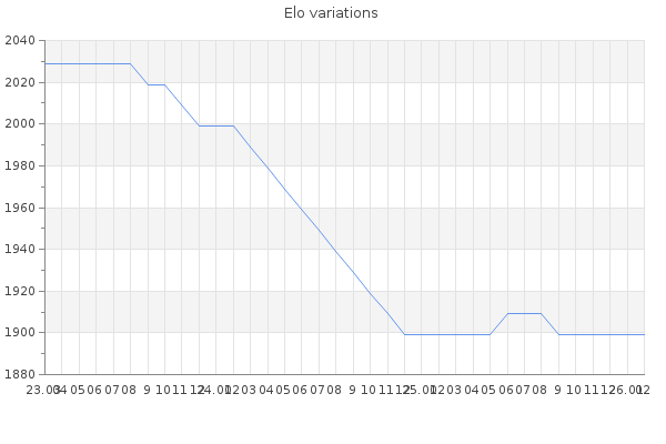 Elo no rounded:1895.9 Rd ( Small rd indicates a reliable elo ) : 206 Elo max :0 Elo max this year :0 Moves played :107 Country:Azerbaijan