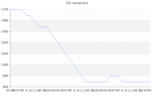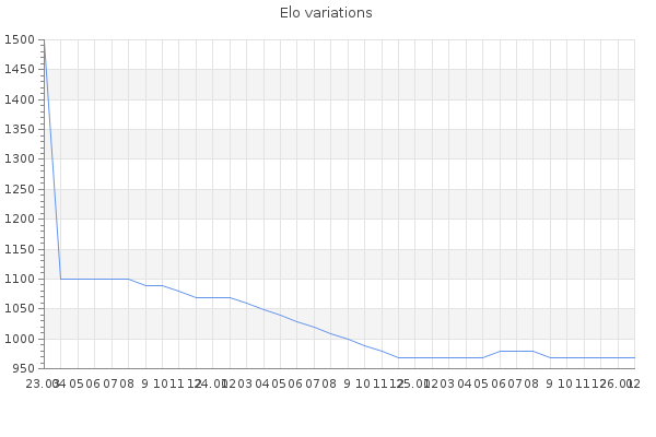Elo no rounded:973.7 Rd ( Small rd indicates a reliable elo ) : 239 Elo max :0 Elo max this year :0 Moves played :10 Country:France