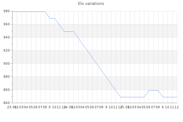 Elo no rounded:844.6 Rd ( Small rd indicates a reliable elo ) : 186 Elo max :0 Elo max this year :0 Moves played :47 Country:Belgium