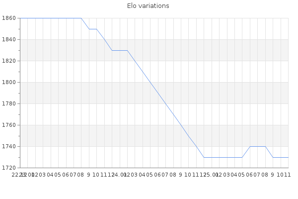 Elo no rounded:1726.6 Rd ( Small rd indicates a reliable elo ) : 113 Elo max :1910 Elo max this year :1910 Moves played :462 Country:United Kingdom