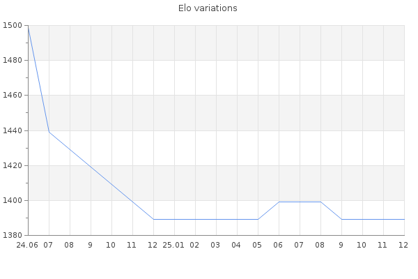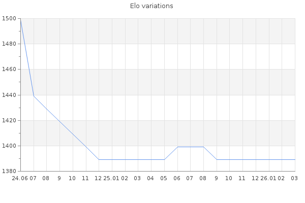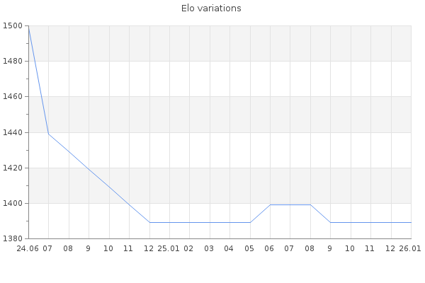 Elo no rounded:1392.3 Rd ( Small rd indicates a reliable elo ) : 162 Elo max :0 Elo max this year :0 Moves played :100 Country:Czech Republic