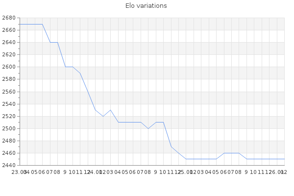 Elo no rounded:2452 Rd ( Small rd indicates a reliable elo ) : 91 Fast Elo :2130 Fast Rd : 117 Elo max :2690 Elo max this year :2690 Moves played :5560 Country:United Kingdom