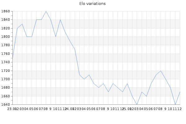 Elo no rounded:1672.4 Rd ( Small rd indicates a reliable elo ) : 87 Fast Elo :1449 Fast Rd : 253 Elo max :2040 Elo max this year :2040 Moves played :17207 Country:Holy See (Vatican City)