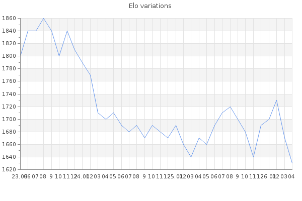 Elo no rounded:1633.9 Rd ( Small rd indicates a reliable elo ) : 84 Fast Elo :1449 Fast Rd : 253 Elo max :2040 Elo max this year :2040 Moves played :17557 Country:Holy See (Vatican City)