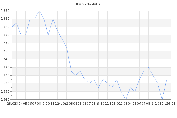 Elo no rounded:1701.7 Rd ( Small rd indicates a reliable elo ) : 83 Fast Elo :1449 Fast Rd : 253 Elo max :2040 Elo max this year :2040 Moves played :17306 Country:Holy See (Vatican City)
